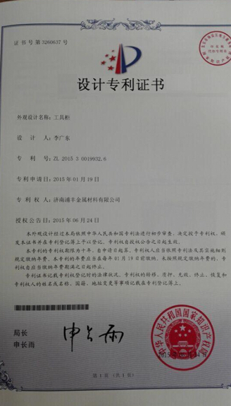 浦豐柜業(yè):2015夏季新款抽屜式工具柜專利證書